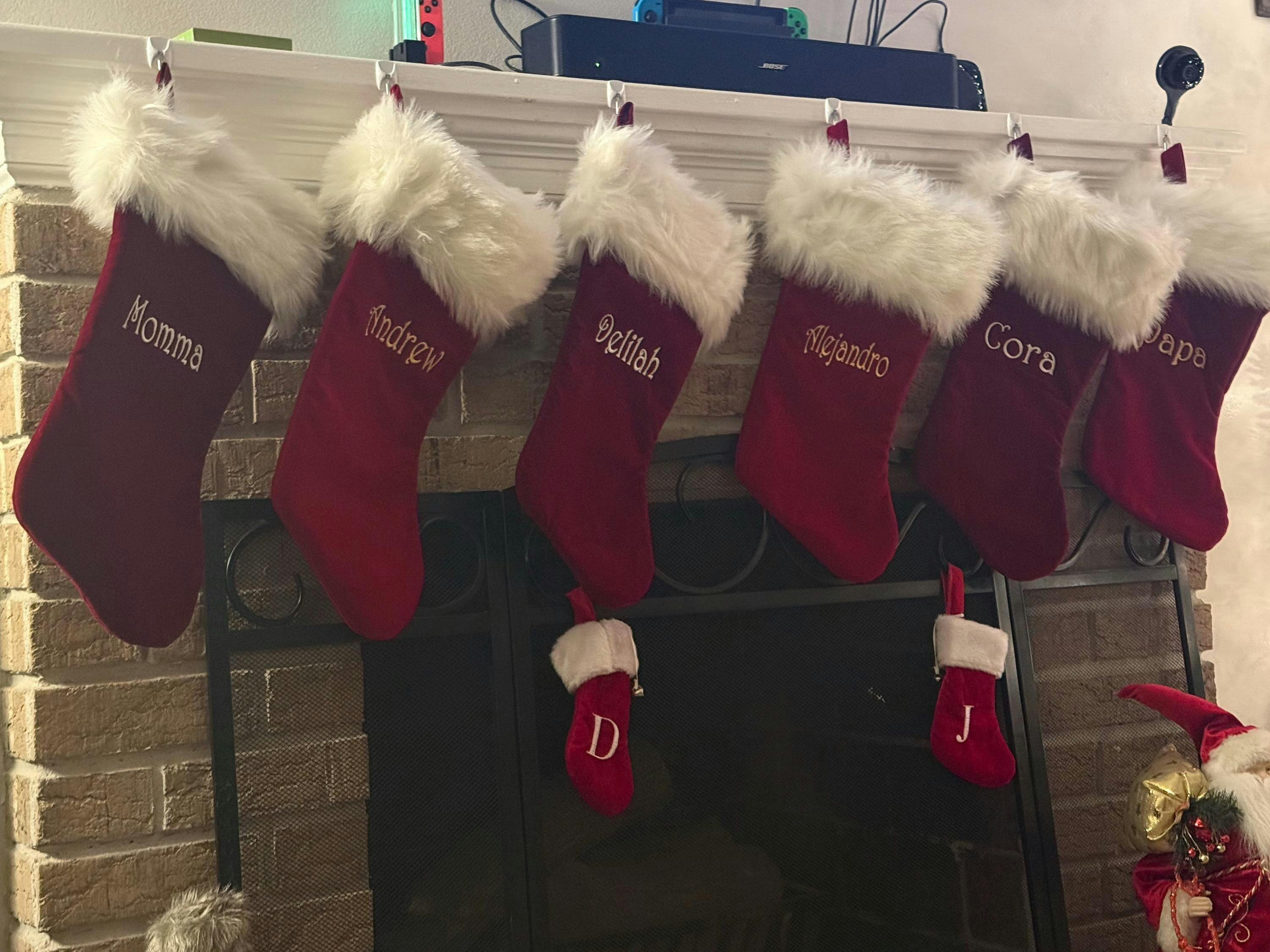 Personalized in metallic embroidery thread - see additional images for personalizing choices: Embroidery thread color and Embroidery font. The stockings in the pictures are embroidered in our SILVER metallic tread, which is more like PLATINUM, so in the pictures, it looks white but in person, it has that metallic shimmer that makes the embroidery pop. The main photo features stockings personalized in HAND FONT.