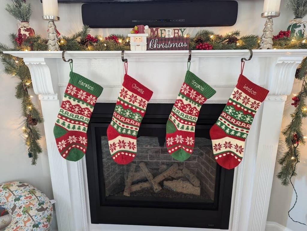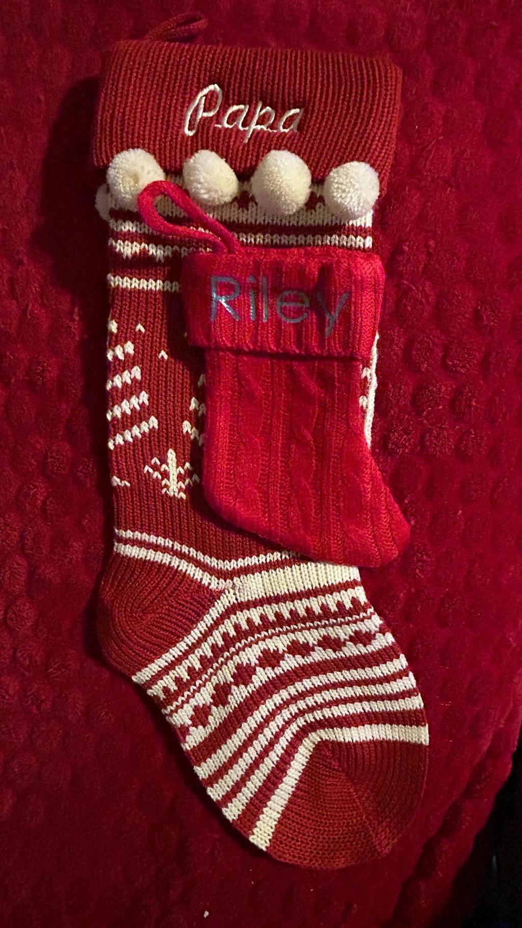 Personalized in gorgeous embroidery thread - see additional images for personalizing choices: Embroidery thread color and Embroidery font. These stockings look great embroidered in off-white thread, we also have gold, silver, metallic red, metallic green as well as regular red and regular green threads.