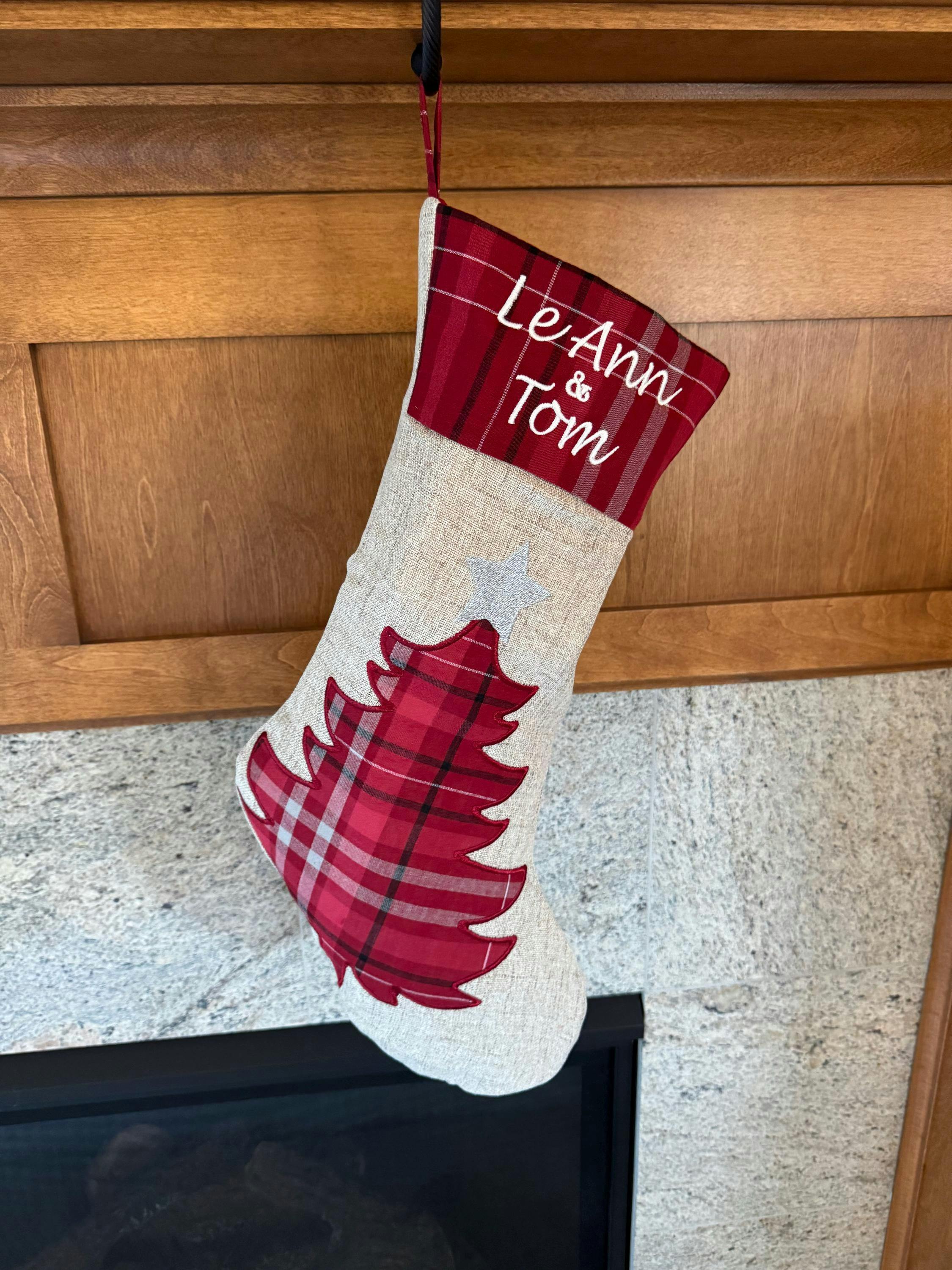 This hand crafted stocking is the perfect accent to your rustic holiday décor with a red plaid cuff, applique tree, Santa, or reindeer.