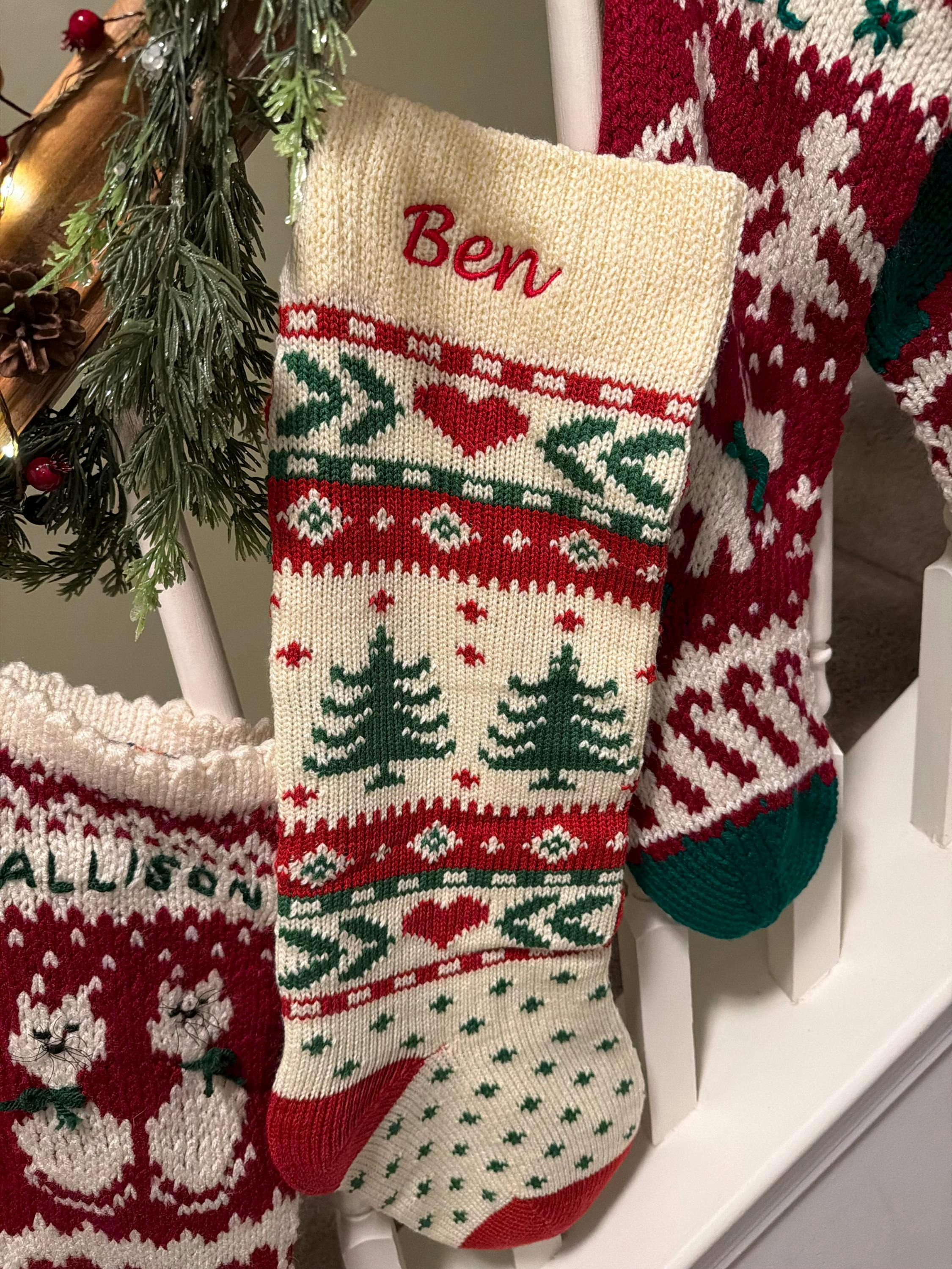 Knitted Ivory Christmas Stockings with Red Green knit Snowflake Tree Heart Fun Festive Family Designs Personalized Embroidered Name