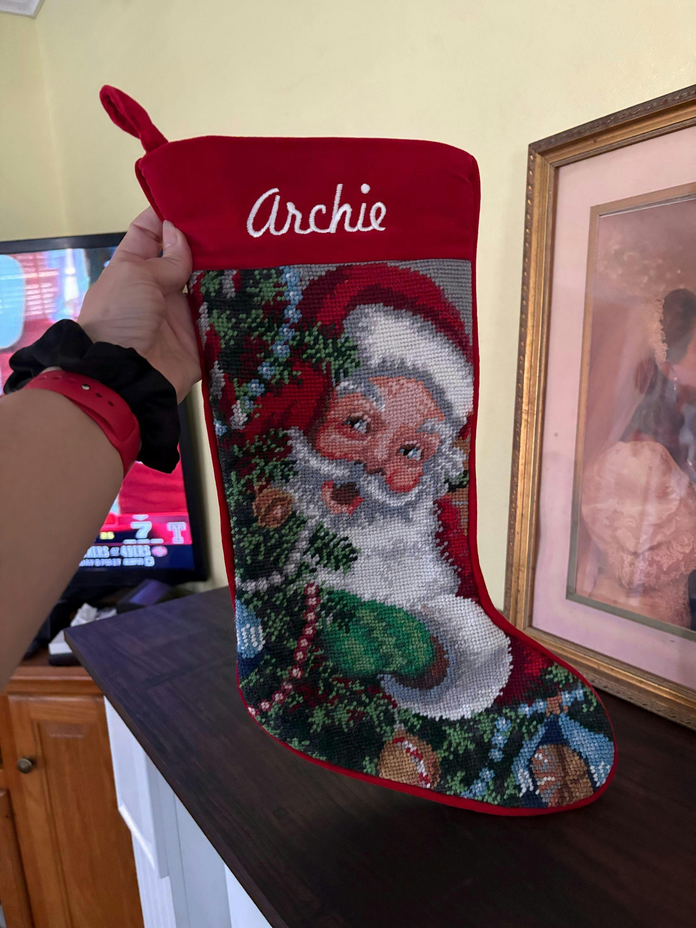 CUFF: 7.5" to 8" Wide Velvet Cuff. Experience the elegance of our needlepoint stockings with a plush velvet cuff that adds a touch of opulence to your holiday decor.