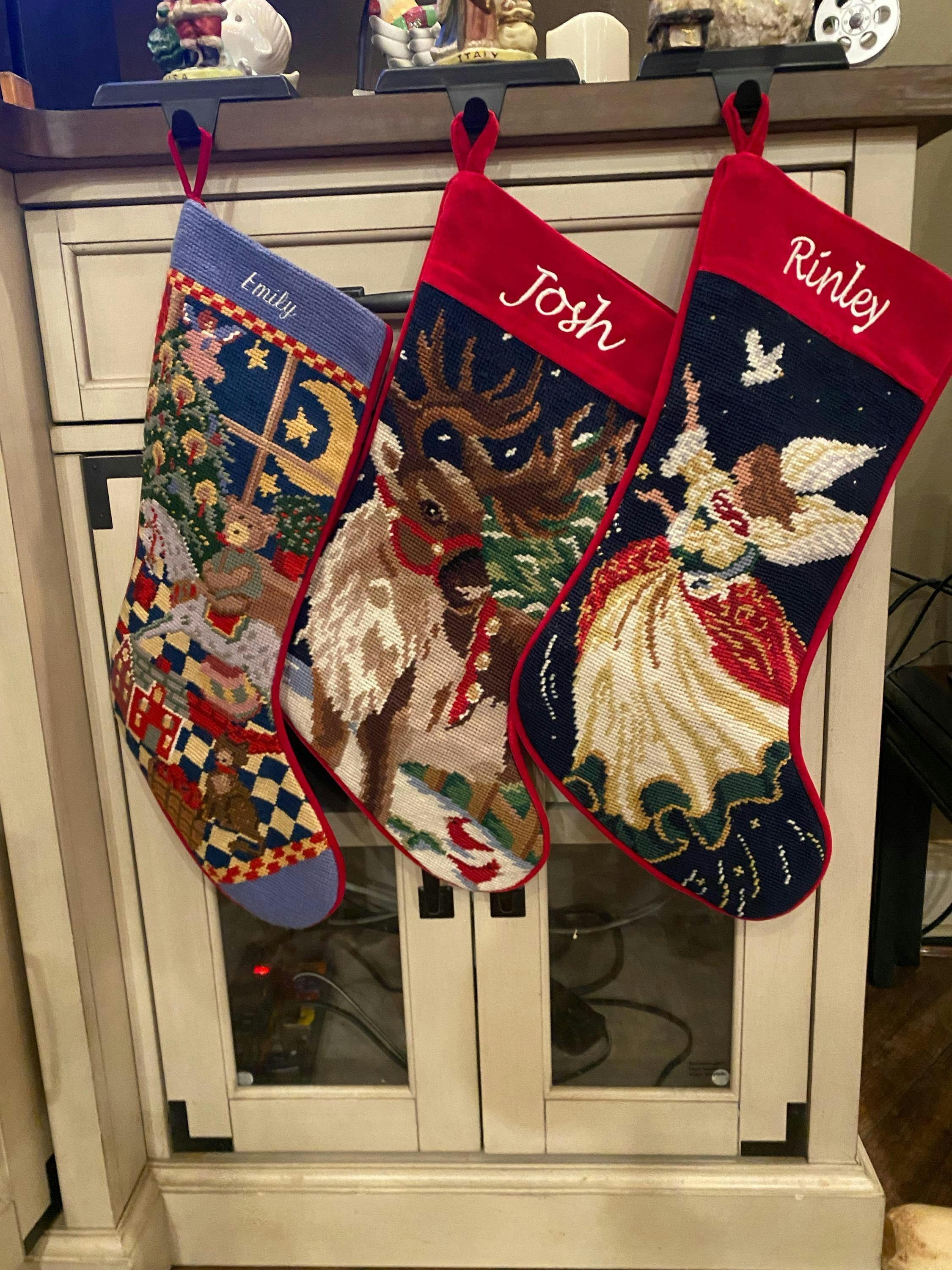 Our Needlepoint Stockings, a blend of tradition and innovation, designed to become cherished heirlooms for your family. Shop now and discover the perfect addition to your holiday decorations.  Our 2025 designs, such as Needlepoint Christmas Train, Pet Paw Tree, Santa with Sled and Gifts, Angel over the Christmas Village, Santa & Reindeer Decorating the Christmas Tree,  Snowman by Tree with Cardinals,...