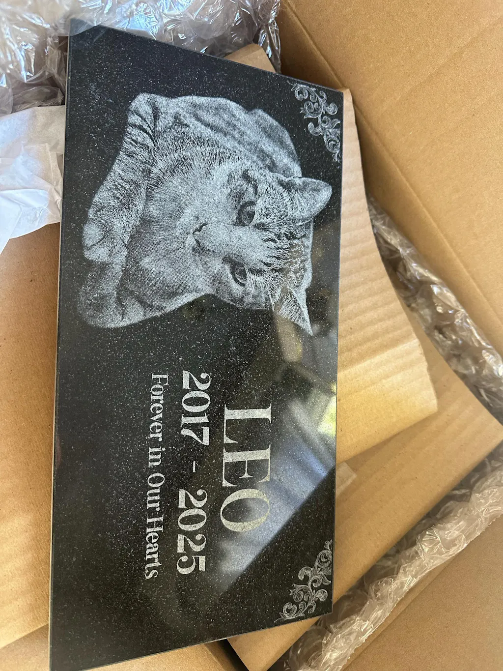 These pet headstones come in various sizes and styles, and we offer custom engraving options for both text and imagery to ensure the perfect remembrance for your pet.