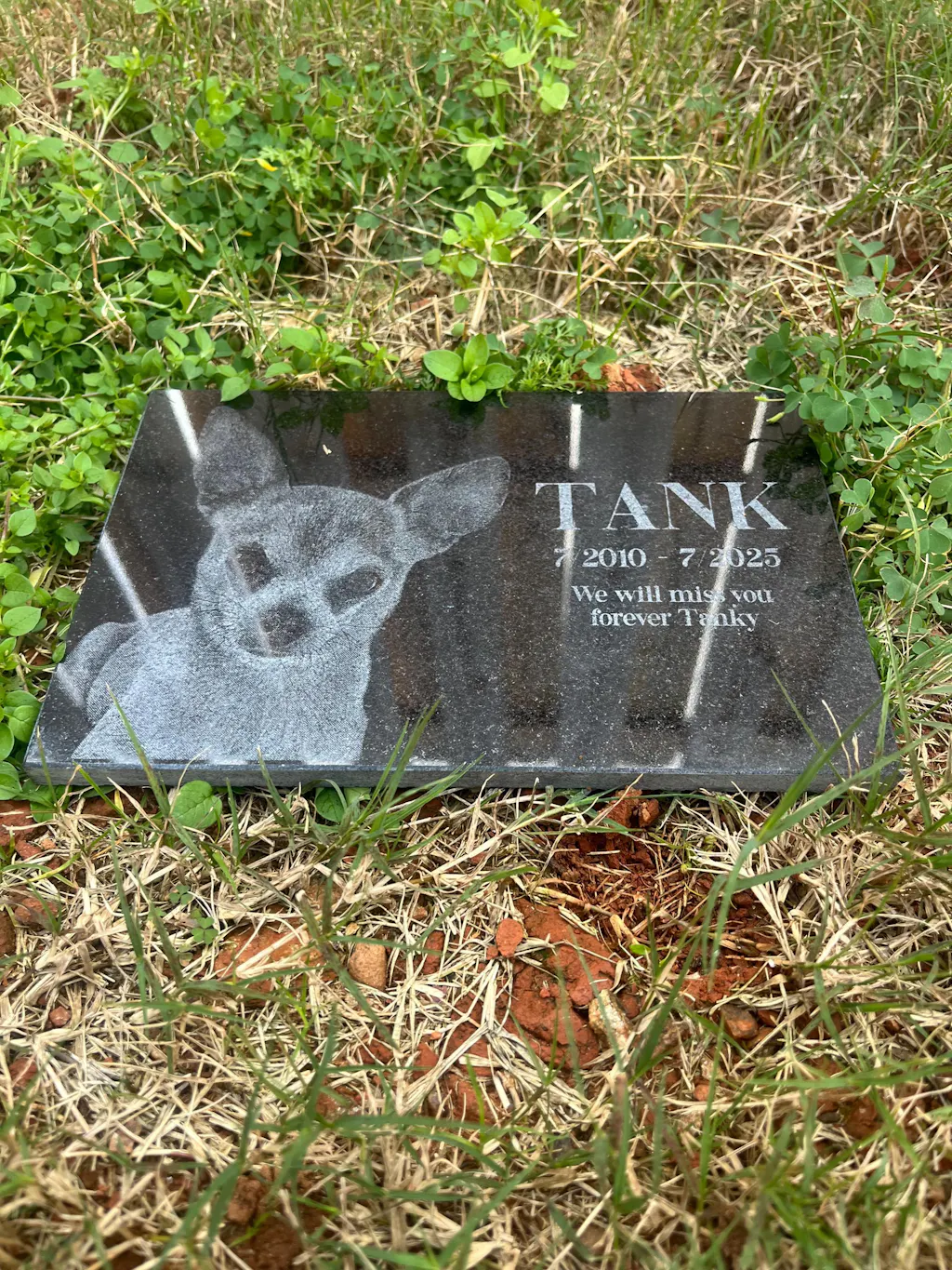 Honor the memory of your beloved pet with a custom engraved pet memorial stone. Whether you’re commemorating a cherished cat, dog, bird, or any beloved animal, our personalized pet headstones are crafted from high-quality granite to create a lasting tribute. Perfect for outdoor display in gardens, pet burial sites, or even as a flat headstone for a pet cemetery, each marker is custom-designed with unlimited text and one image of your pet.