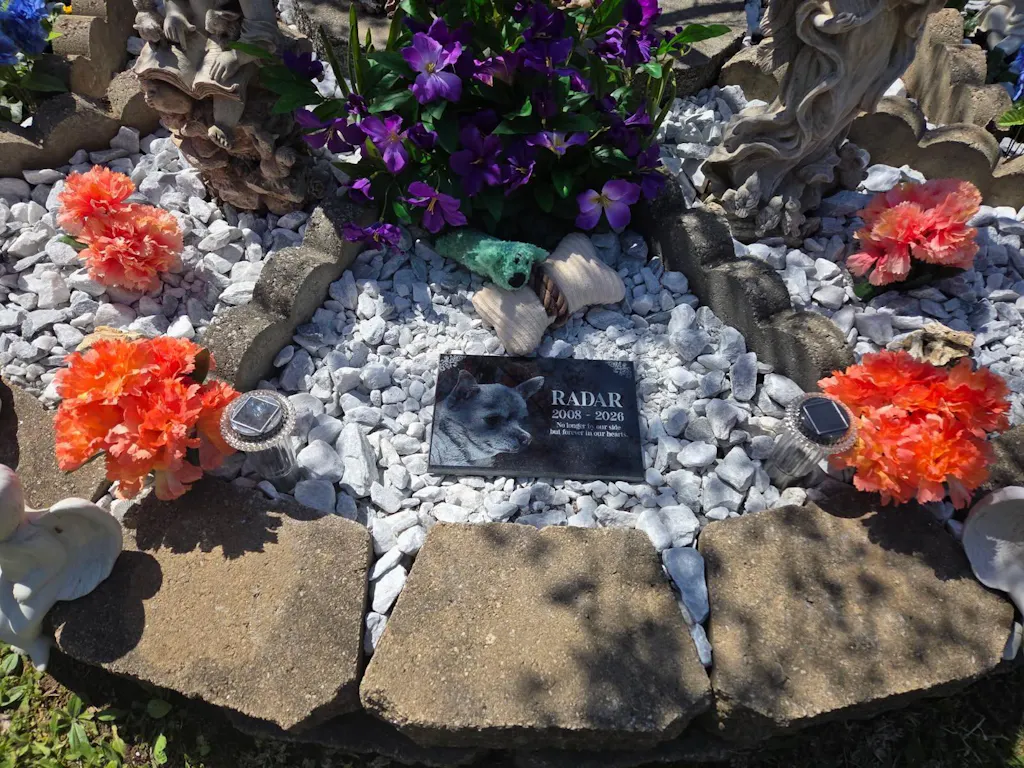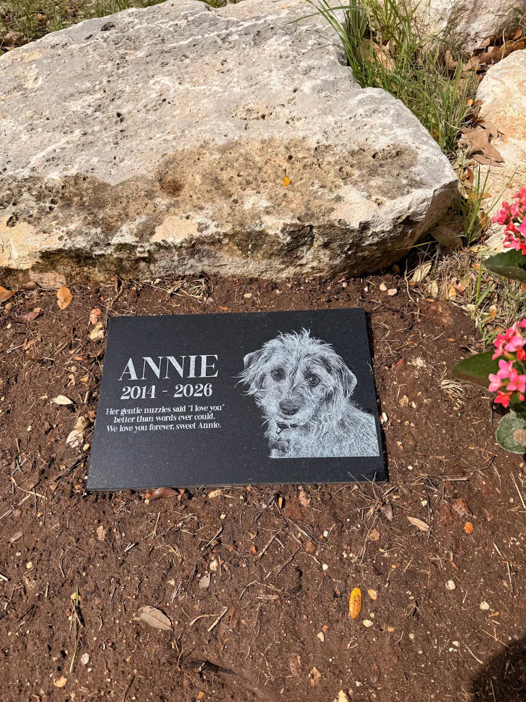 Honor the memory of your beloved pet with a custom engraved pet memorial stone. Whether you’re commemorating a cherished cat, dog, bird, or any beloved animal, our personalized pet headstones are crafted from high-quality granite to create a lasting tribute. Perfect for outdoor display in gardens, pet burial sites, or even as a flat headstone for a pet cemetery, each marker is custom-designed with unlimited text and one image of your pet.