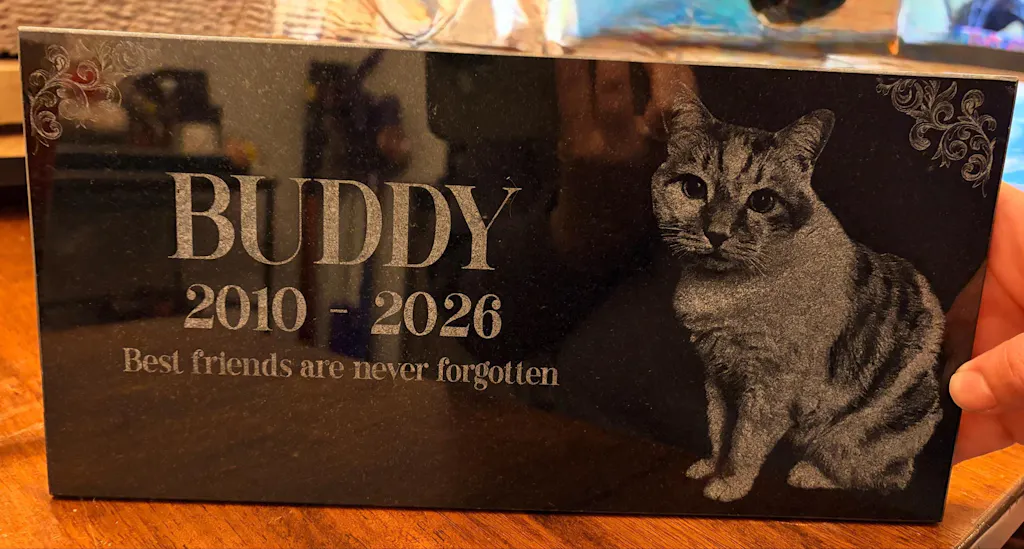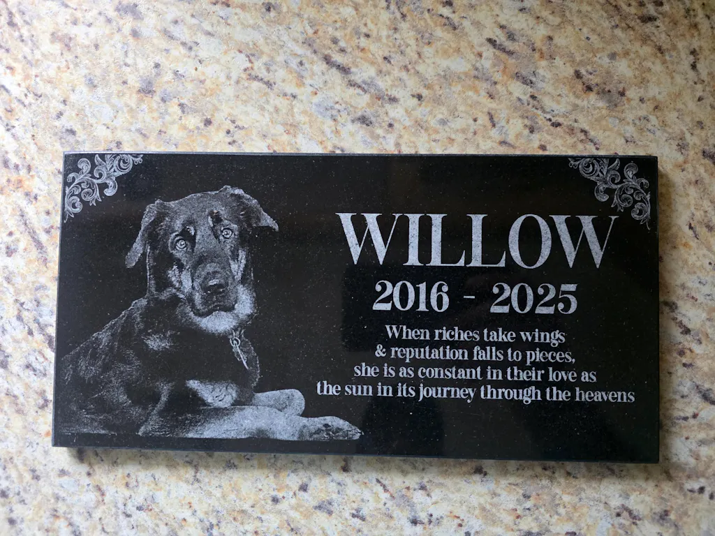 Our art department carefully creates a proof of your pet grave marker before anything is engraved, and we only proceed once you give final approval. The engraved pet memorial is laser-etched with your pet’s photo and any special message you wish to include, ensuring your pet’s memory is preserved beautifully. With exceptional durability and weather resistance, these pet memorial stones will endure the elements while serving as a meaningful tribute to the loss of your family’s cherished pet.