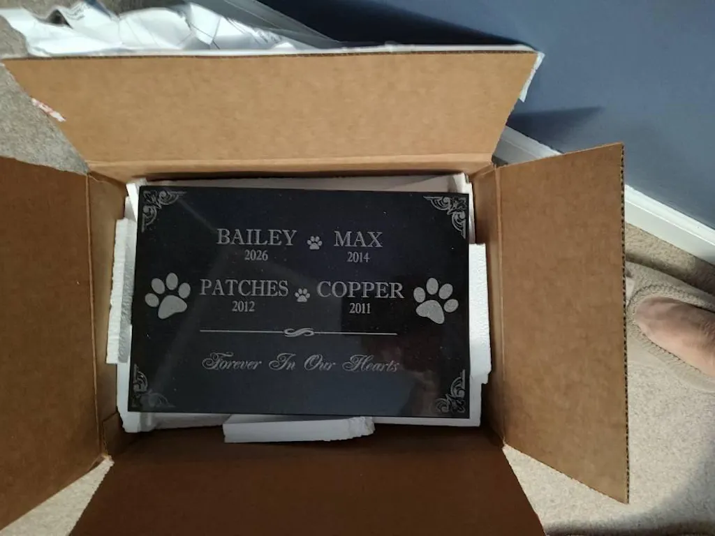 Our art department carefully creates a proof of your pet grave marker before anything is engraved, and we only proceed once you give final approval. The engraved pet memorial is laser-etched with your pet’s photo and any special message you wish to include, ensuring your pet’s memory is preserved beautifully. With exceptional durability and weather resistance, these pet memorial stones will endure the elements while serving as a meaningful tribute to the loss of your family’s cherished pet.