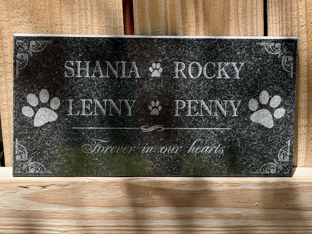 Honor the memory of your beloved pet with a custom engraved pet memorial stone. Whether you’re commemorating a cherished cat, dog, bird, or any beloved animal, our personalized pet headstones are crafted from high-quality granite to create a lasting tribute. Perfect for outdoor display in gardens, pet burial sites, or even as a flat headstone for a pet cemetery, each marker is custom-designed with unlimited text and one image of your pet.