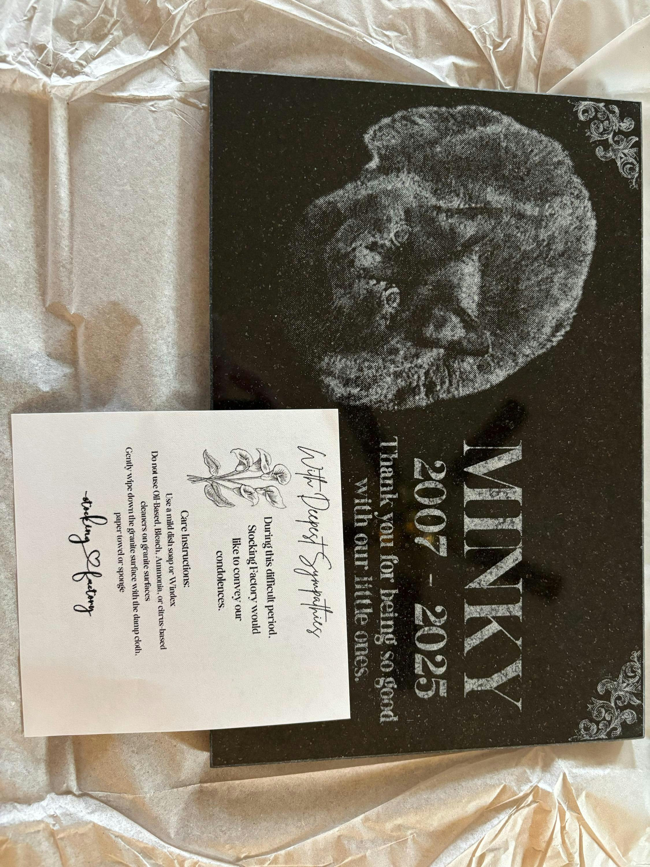 Honor the memory of your beloved pet with a custom engraved pet memorial stone. Whether you’re commemorating a cherished cat, dog, bird, or any beloved animal, our personalized pet headstones are crafted from high-quality granite to create a lasting tribute. Perfect for outdoor display in gardens, pet burial sites, or even as a flat headstone for a pet cemetery, each marker is custom-designed with unlimited text and one image of your pet.