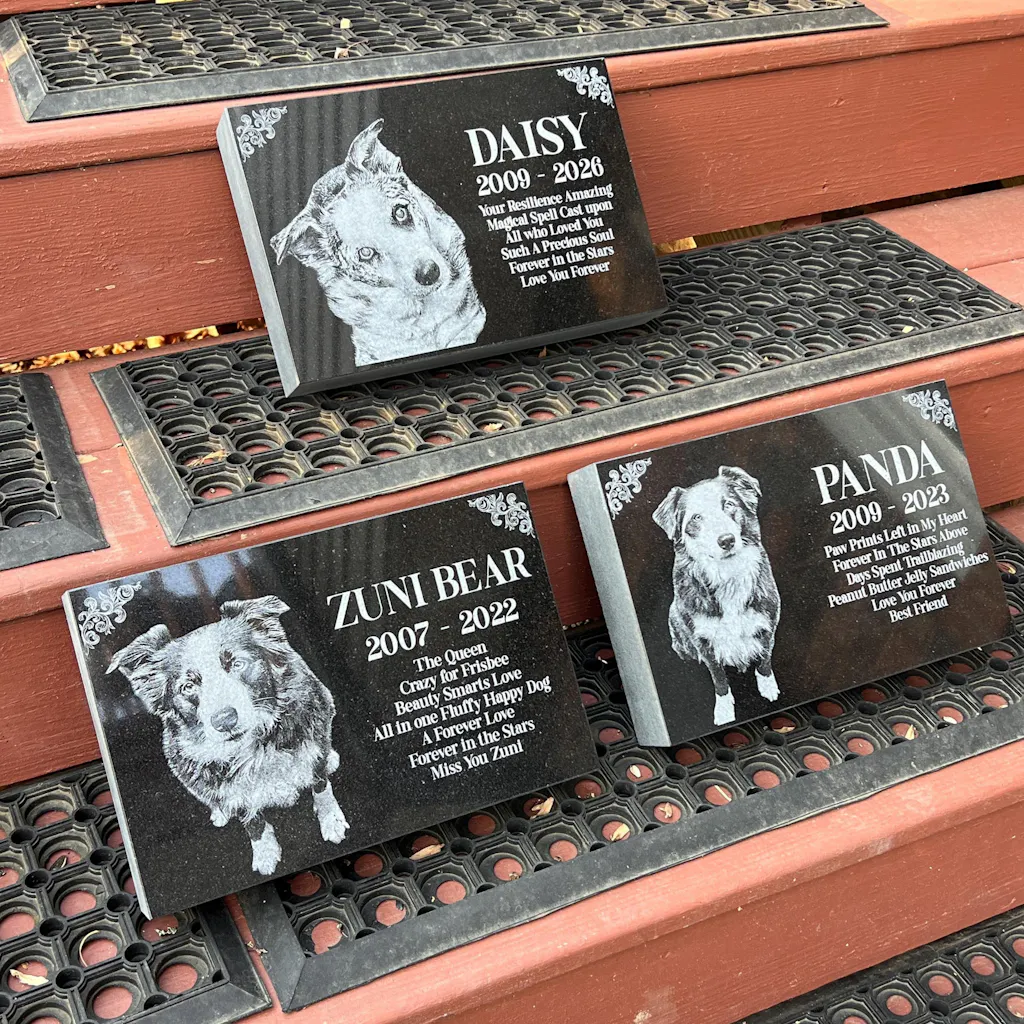These pet headstones come in various sizes and styles, and we offer custom engraving options for both text and imagery to ensure the perfect remembrance for your pet.