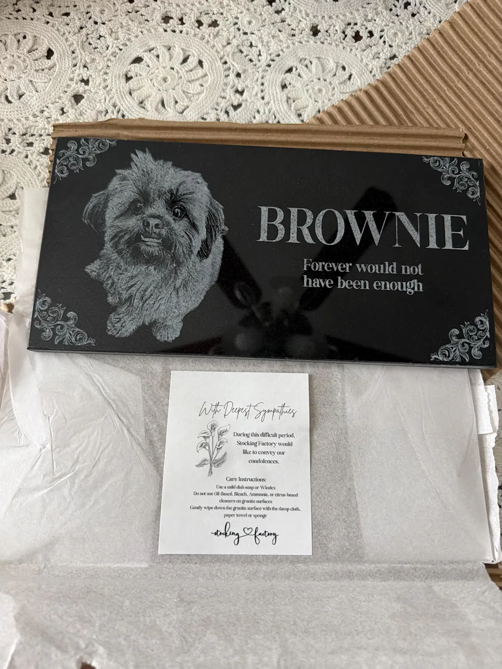 Honor the memory of your beloved pet with a custom engraved pet memorial stone. Whether you’re commemorating a cherished cat, dog, bird, or any beloved animal, our personalized pet headstones are crafted from high-quality granite to create a lasting tribute. Perfect for outdoor display in gardens, pet burial sites, or even as a flat headstone for a pet cemetery, each marker is custom-designed with unlimited text and one image of your pet.