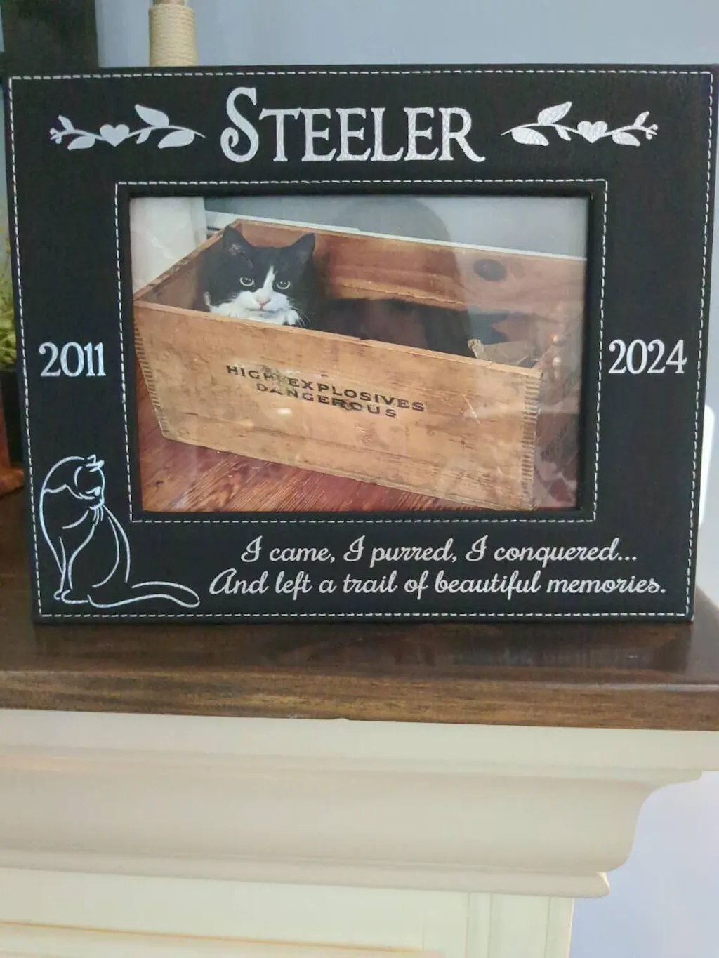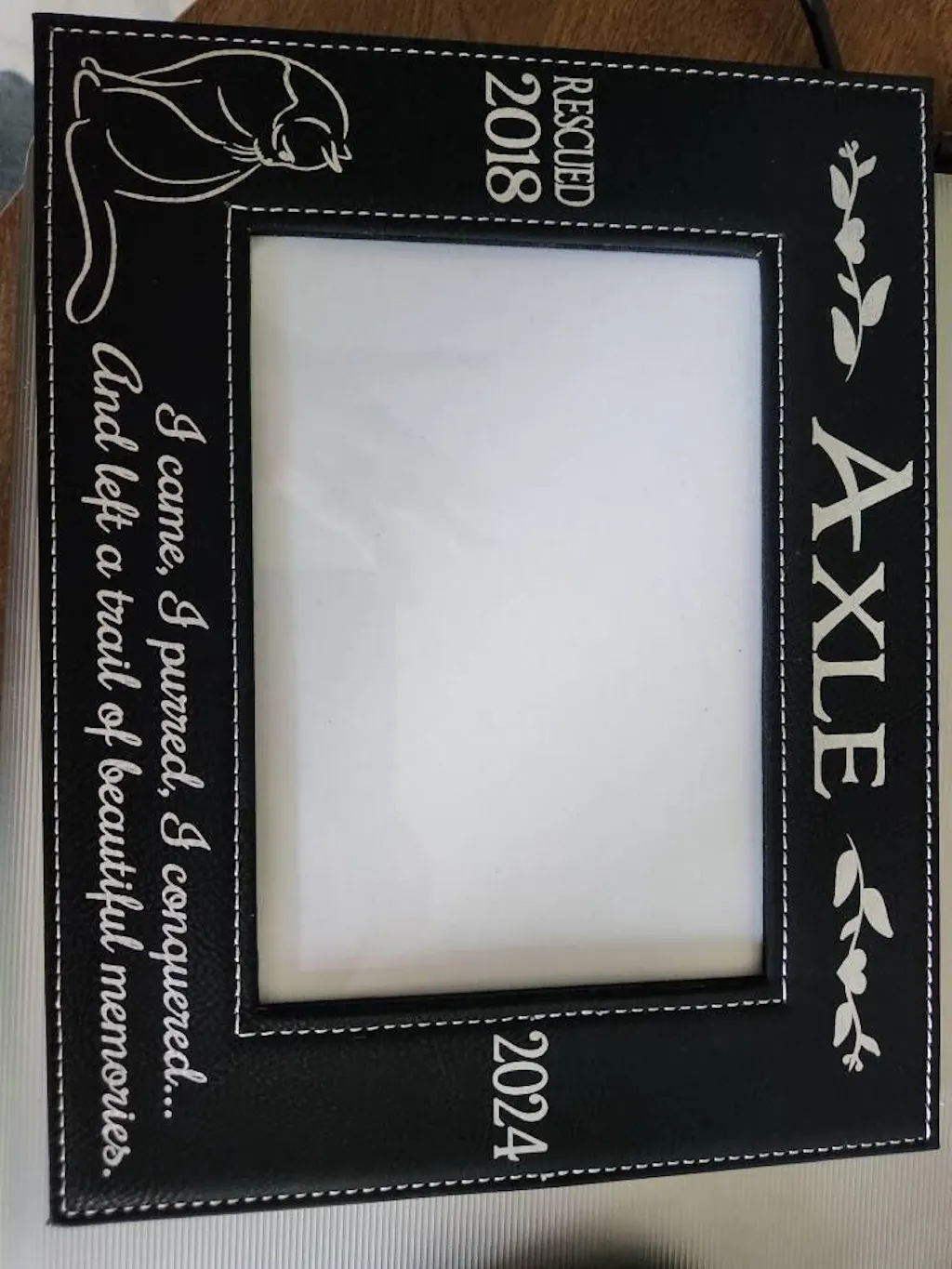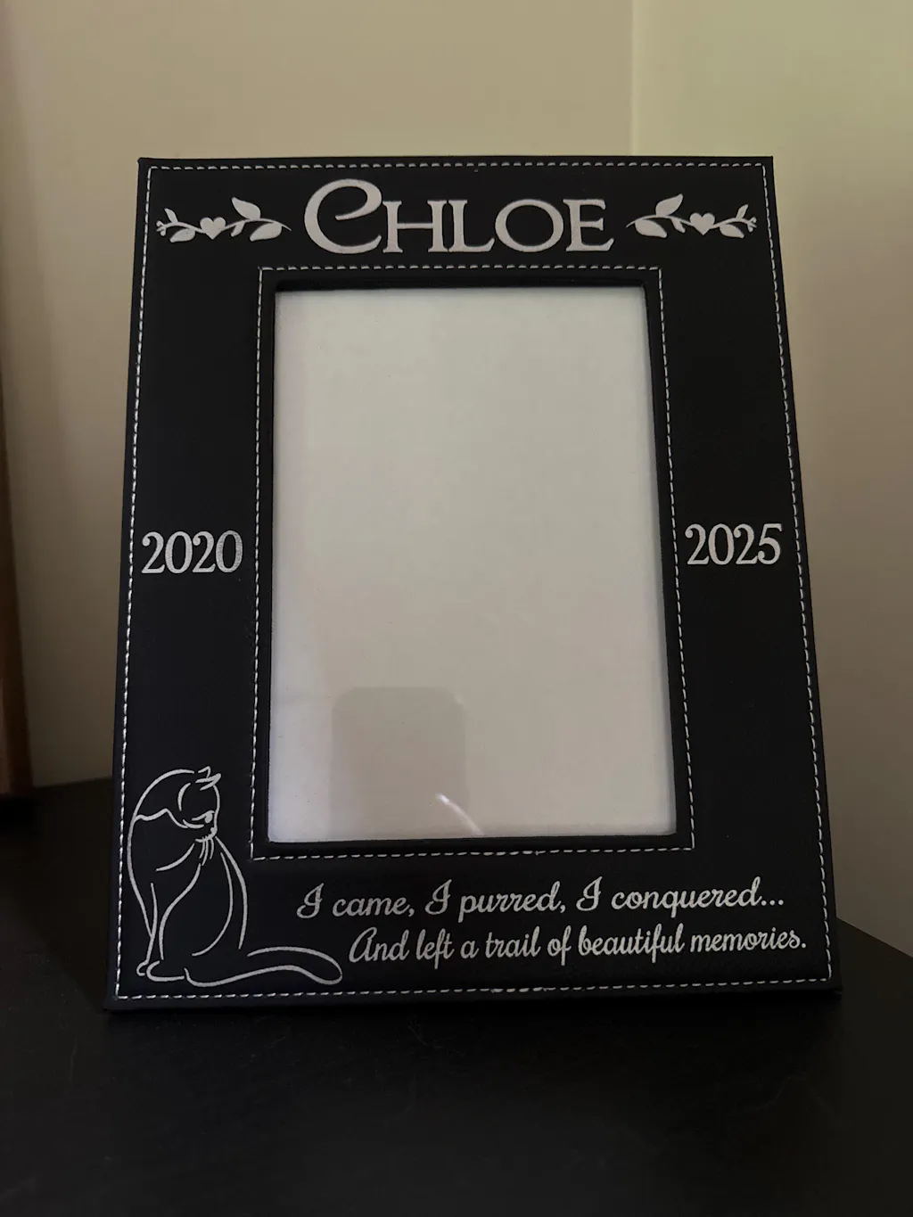 Picture Frame Leather Black Engraved Personalized Fits 5x7 Picture Comes with the "I came, I purred, I conquered...And left a trail of beautiful memories." Quote Cat Silhouette Design and Personalized with Pets Name, Birth Year and Passed Away Year.