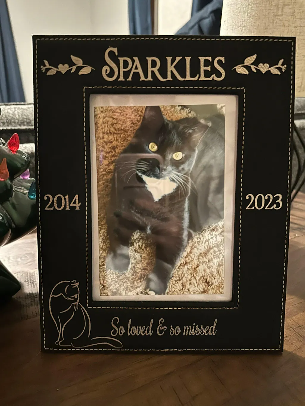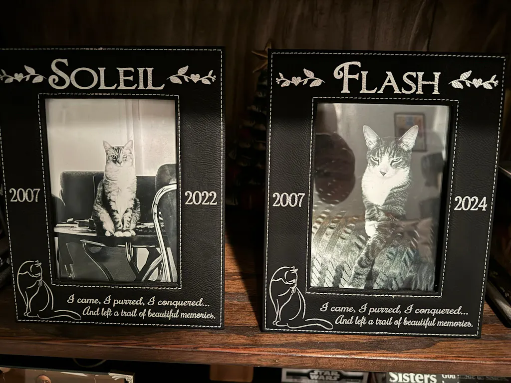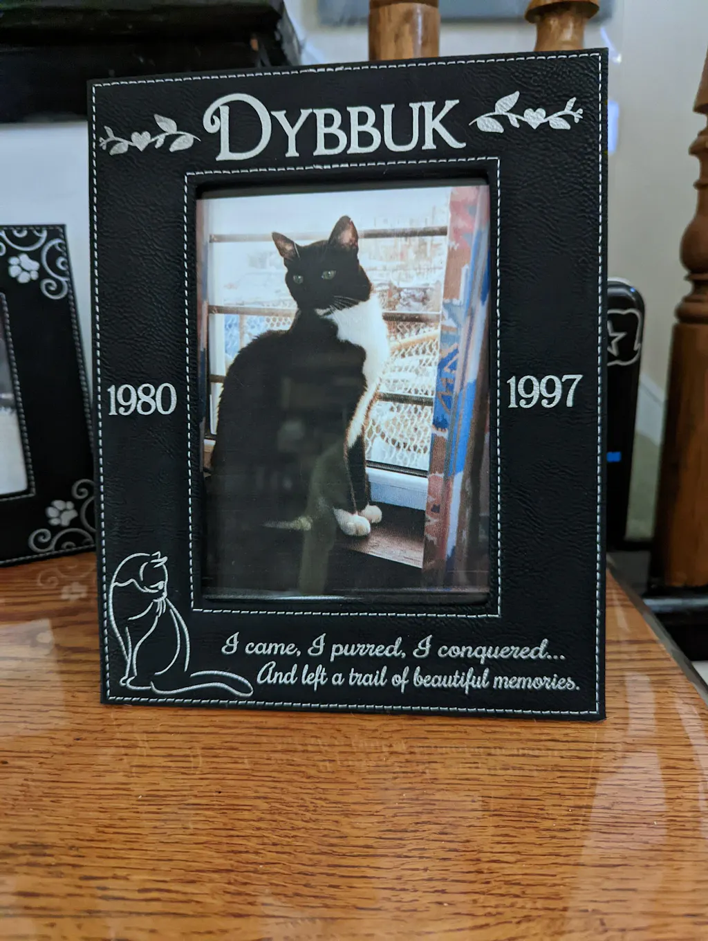 Picture Frame Leather Black Engraved Personalized Fits 5x7 Picture Comes with the "I came, I purred, I conquered...And left a trail of beautiful memories." Quote Cat Silhouette Design and Personalized with Pets Name, Birth Year and Passed Away Year.
