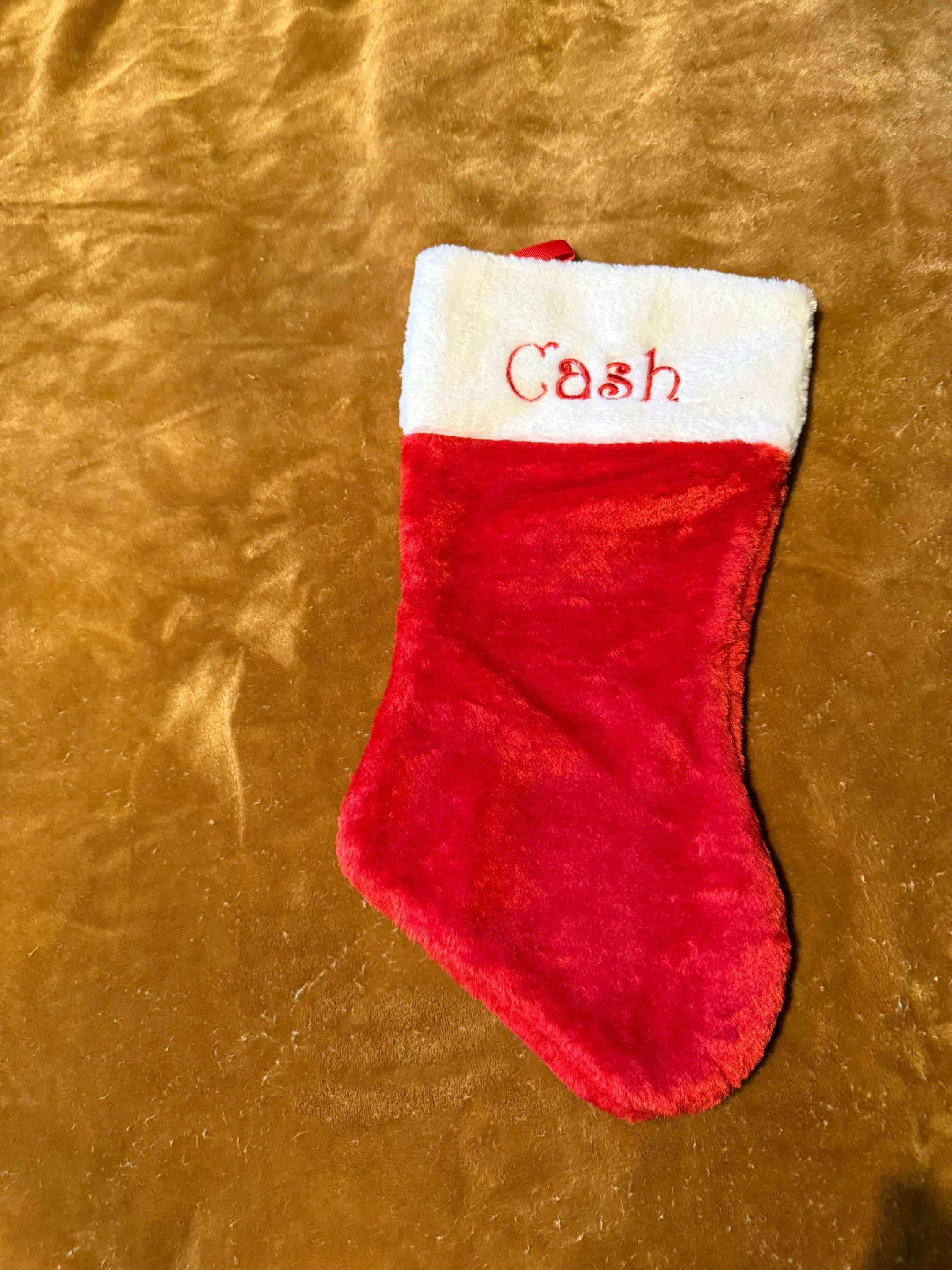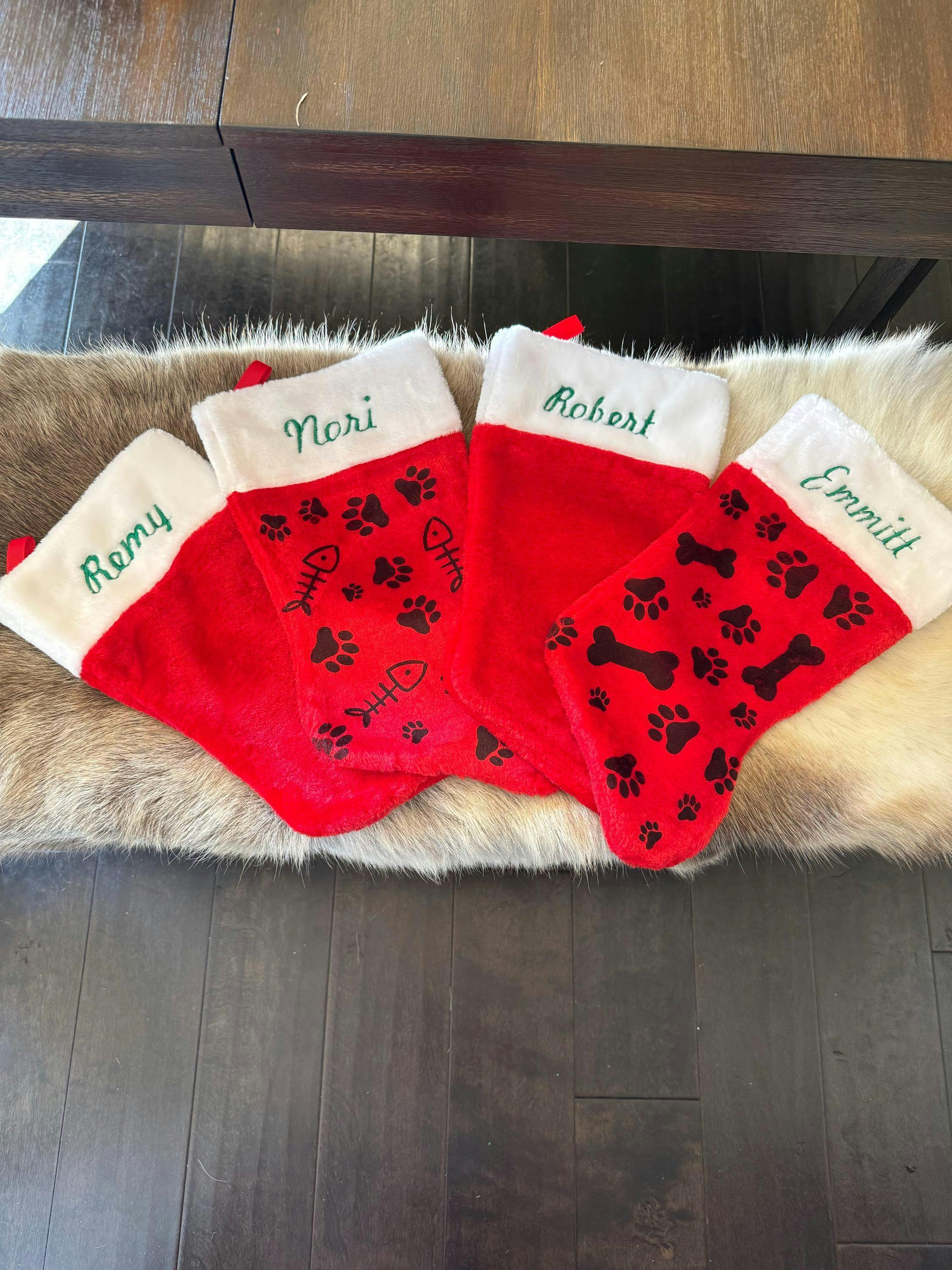 Our most popular personalized Christmas stockings. These Christmas stockings can be personalized in embroidery green or red or other festive color threads.  Available in Red White as Family stockings - but do not forget your PETS!  We have Paws and Bones design for dogs and Paws and Fish design for Cats.